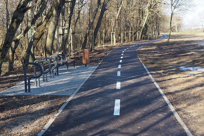 Zhruba po 900 metroch je na trase vybudované odpočívadlo so stojanom na bicykle, lavičkou a odpadkovým košom. Súčasťou zákazky boli aj sadovnícke úpravy: popri cyklotrase bolo vysadených viac ako 50 vyrastených stromov, ktoré sú ukotvené, a realizovaný bol aj výsev trávy. Zdroj spomína najmä novovysadené jasene a lipy.