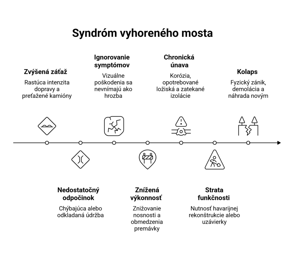 Most, podobne ako človek, môže byť dlho „v pohode“, aj keď v ňom už ticho prebieha únava materiálu, drobné trhliny, mikrodeformácie. Až raz zlyhá. Pretože podobne ako človek, aj most potrebuje starostlivosť, pozornosť a odbornú prevenciu.