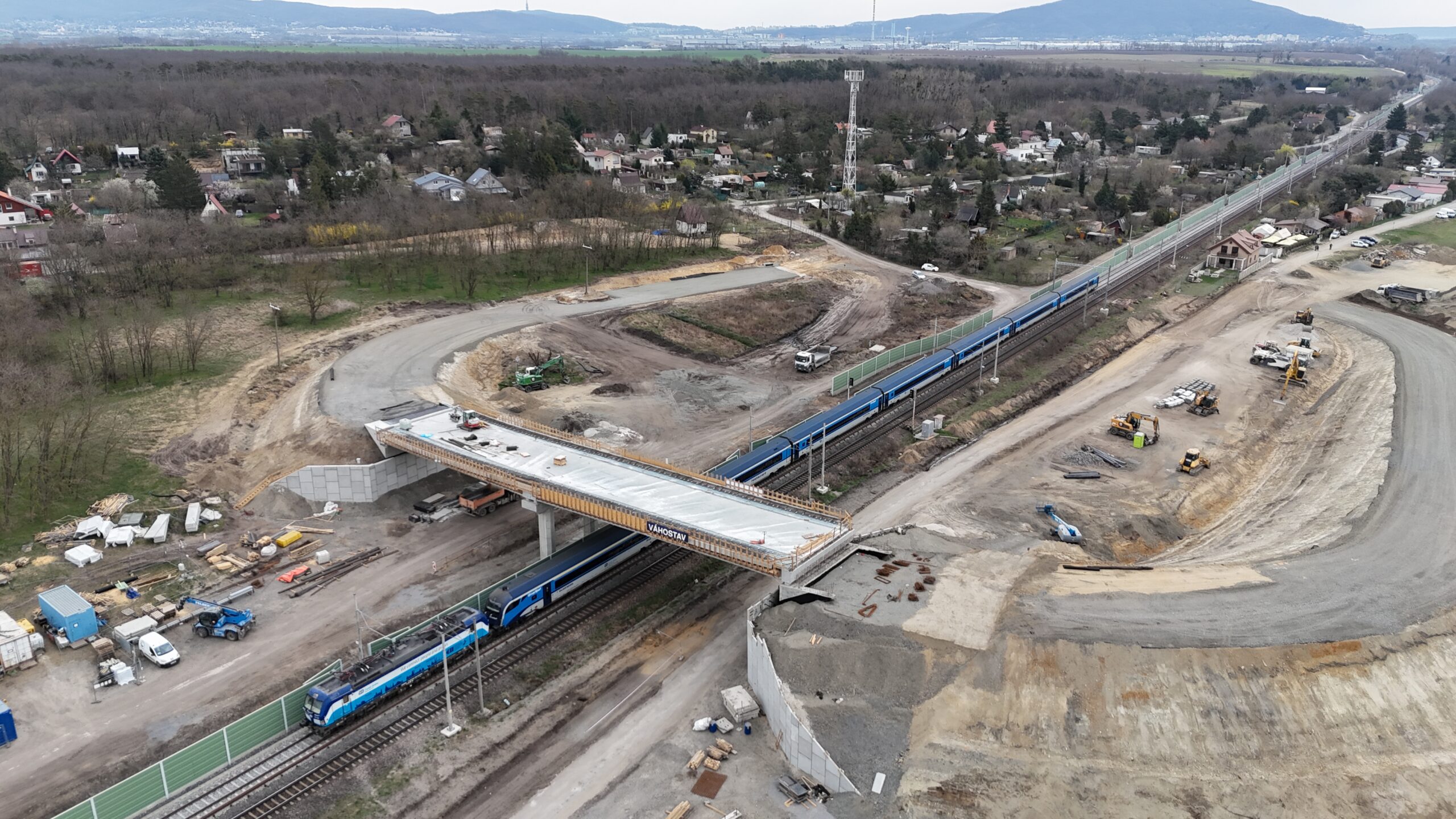 Rozsiahle zemné telesá naznačujú budúce napojenie cestnej komunikácie na nadjazd, prebieha hutnenie, modelovanie svahov a príprava konštrukčných vrstiev, na stavbe je stále intenzívna mechanizácia – ide o aktívnu fázu realizácie. Prvá koľaj je už v tejto časti zrekonštruovaná, osadené sú trakčné stožiare aj protihlukové steny.