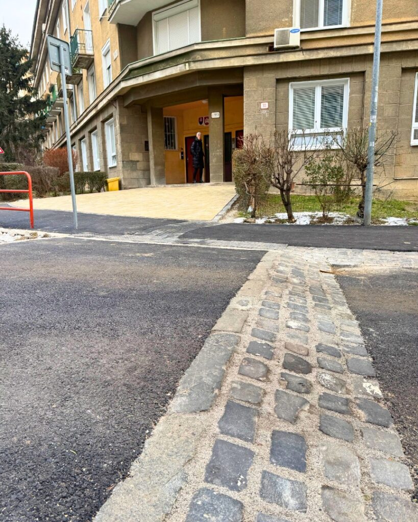 Zvyšok ulice bol realizovaný s asfaltovým povrchom, čo umožnilo rýchlejšiu a finančne efektívnejšiu opravu väčšej plochy.